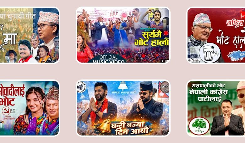 यसपालिको चुनावी प्रचारमा ‘बदलियो कांग्रेस, बदल्छौँ देश’, ‘युवाको आशा भरोसाको केन्द्र गगन दाइ’, ‘सै पनि एमाले, मैं पनि एमाले’, ‘एमाले हुँ म’, ‘अब की बार बालेन सरकार’, ‘घण्टी बजाऊ’, ‘राष्ट्रनायक प्रचण्ड’देखि ‘गाउँ गाउँबाट उठ, बस्ती-बस्तीबाट उठ’ जस्ता गीतहरू सम्बन्धित पार्टीको घरदैलो र चुनावी सभाहरूमा घन्किरहेका छन् ।