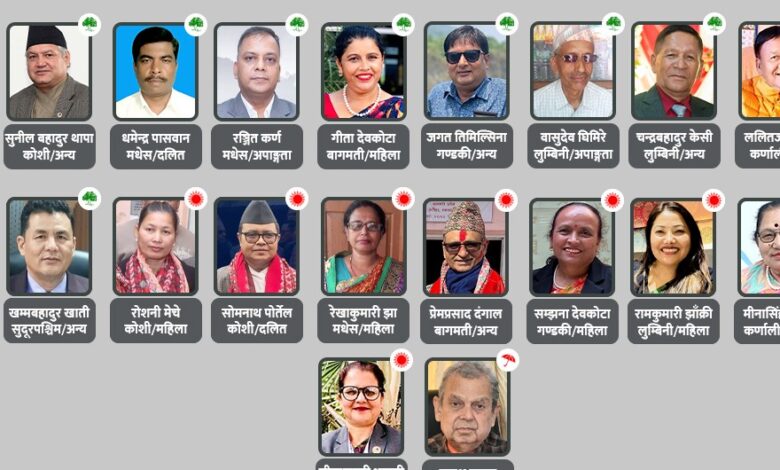 राष्ट्रिय सभा सदस्यमा महन्थ ठाकुर, रामकुमारी झाँक्री, सुनिलबहादुर थापा, ललितजंग शाही, रामकुमारी झाँक्री, सुनीलबहादुर थापा, रोशनी मेचे, धमेन्द्र पासवान, रन्जित कर्ण, रेखा झा, सोम पोर्तेल, गीता देवकोटा, डा. प्रेम दंगाल, जगत तिमिल्सिना, सम्झना देवकोटा, वासुदेव जंगली, चन्द्रबहादुर केसी, मिना रखाल, खम्मबहादुर खाती र लीला भण्डारी निर्वाचित भएका थिए।