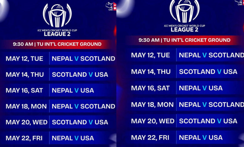 काठमाण्डौ – आईसीसी विश्वकप लिग–२ काठमाडौंमा हुने भएको छ । प्रतियोगिताका खेलहरू आउँदो वैशाख १२ गतेदेखि २२ गतेसम्म हुनेछन् ।